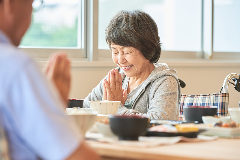 みんなで楽しく昼食の時間です♪飲み込みが不安な方やむせやすい方も、スタッフが丁寧に介助いたします。